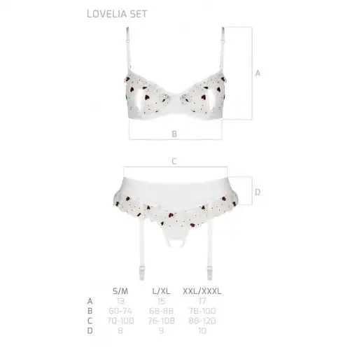 КОМПЛЕКТ LOVELIA в белом цвете станет прекрасным дополнением к вашей коллекции нижнего белья. Этот комплект, созданный Passion, ведущим брендом в мире сексуального нижнего белья и аксессуаров, создан для того, чтобы вы чувствовали себя уверенно и сексуально.