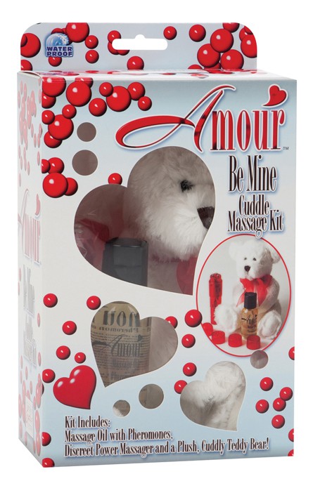 Секс набор AMOUR BE MINE CUDDLE MASSAGE KIT. Оригинальный подарок своей второй половинке! В набор входят: мягкая игрушка, вибратор-массажер с 4 насадками, массажное масло с феромонами. Длина вибратора – 10 см, диаметр – 2,5 см. Питание: 1 батарейка АА (входит в комплект).