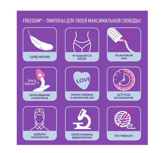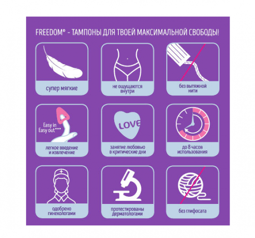 Предлагаем вашему вниманию современное, гигиеническое решение для девушек и женщин во время критических дней, купить безнитевые тампоны Freedom Normal 3 шт. Эти инновационные средства прекрасная замена для обычных тампонов. Они позволяют вести активный образ жизни, не отказывая себе в ежедневных, привычных удовольствиях. Посещайте любимый спортивный клуб, танцпол, бассейн или купайтесь на пляже. Особенностью интим-изделия является возможность заниматься сексом не вынимая его. Ваш партнер не будет испытывать чувства дискомфорта и не узнает, в каком вы сейчас положении.